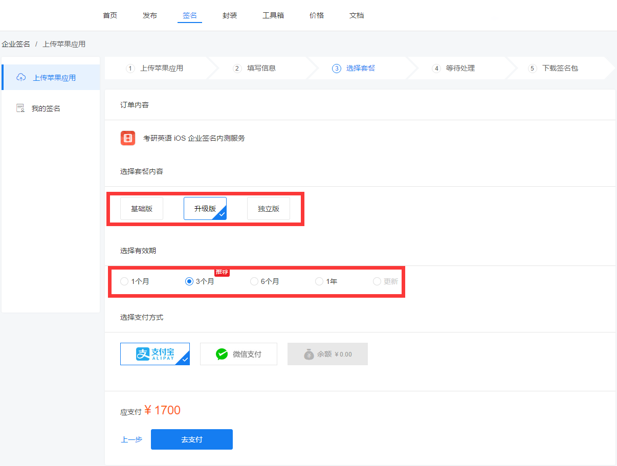 第三步、上传完成后,填写APP相关信息,并根据自身需要选择套餐。